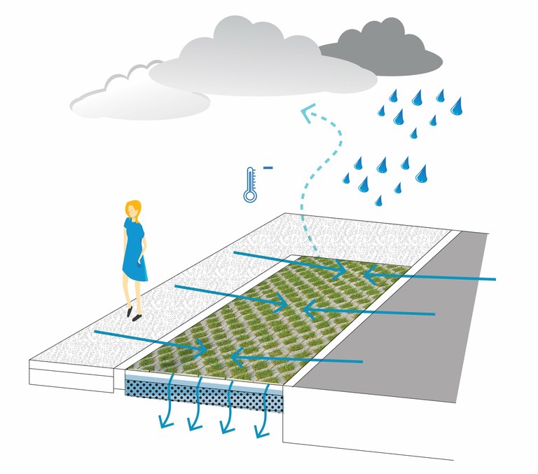 Dalles gazon: Les dalles gazon verdurise la rue tout en accueillant l’eau de pluie des trottoirs, des entrées de garage et de la moitié du profil de la rue. Les fosses d’arbre sans bordures réhaussées permettent aussi d’accueillir l’eau du trottoir qui les arrose. En cas de nouvelle plantation d’arbre on peut en profiter pour abaisser le niveau du sol afin d’augmenter le volume d’eau pouvant être absorbé par la fosse ce qui protège plus efficacement l’arbre du manque d’eau.