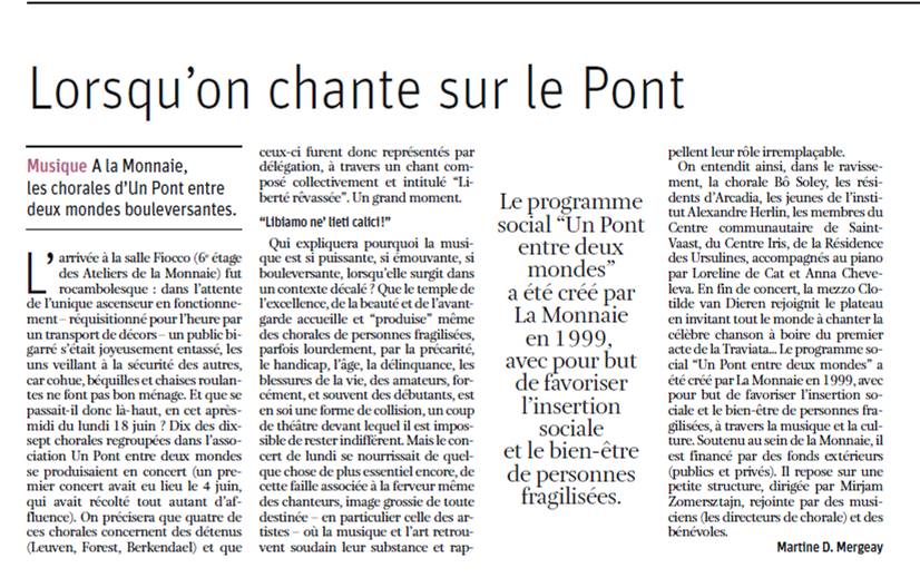 Depuis de nombreuses années, la maison de repos du CPAS de Jette 'Centre IRIS' est partenaire de ce programme et des ateliers hebdomadaires de chant choral y sont organisés. Ce 18 juin, nos résidents, accompagnés du service animation, se sont produits au Théâtre Royal de la Monnaie. L’article de la Libre Belgique ci-dessous relate ce bel après-midi.